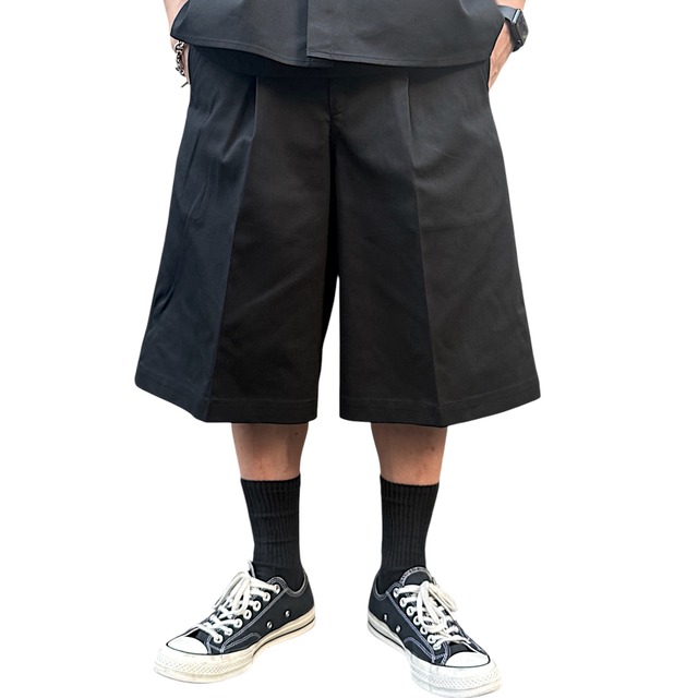 rin / Big WK Slacks Short Pants BLK - ビッグスラックスショートパンツ - ※Polyester 55% Cotton 45% ※MADE IN JAPAN モデルサイズ / 171cm / 72kg / S size ■size寸法 S :ウエスト74cm~86cm 股上29cm 股下33cm 総丈62cm もも幅41cm 裾幅40cm M : ウエスト78cm~90cm 股上29.5cm 股下34.5cm 総丈64cm もも幅42cm 裾幅41cm L : ウエスト82cm~94cm 股上30cm 股下36cm 総丈66cm もも幅43cm 裾幅42cm 素材は、度詰のハリ感が強いチノ素材。厚みはそこまで無いですが、しっかりとした風合いの生地です。これからの季節にもおすすめの質感。 シルエットは大きめなショーツシルエット。計算されたフォルムは、生地との相性で作られる形がはっきり出る仕様。細部にも拘り機能面を考えたポケット。ウエストにもゴム入りなのでストレスなく着れます。 これからのシーズンから秋口まで大活躍してくれるアイテムをお見逃しなく!