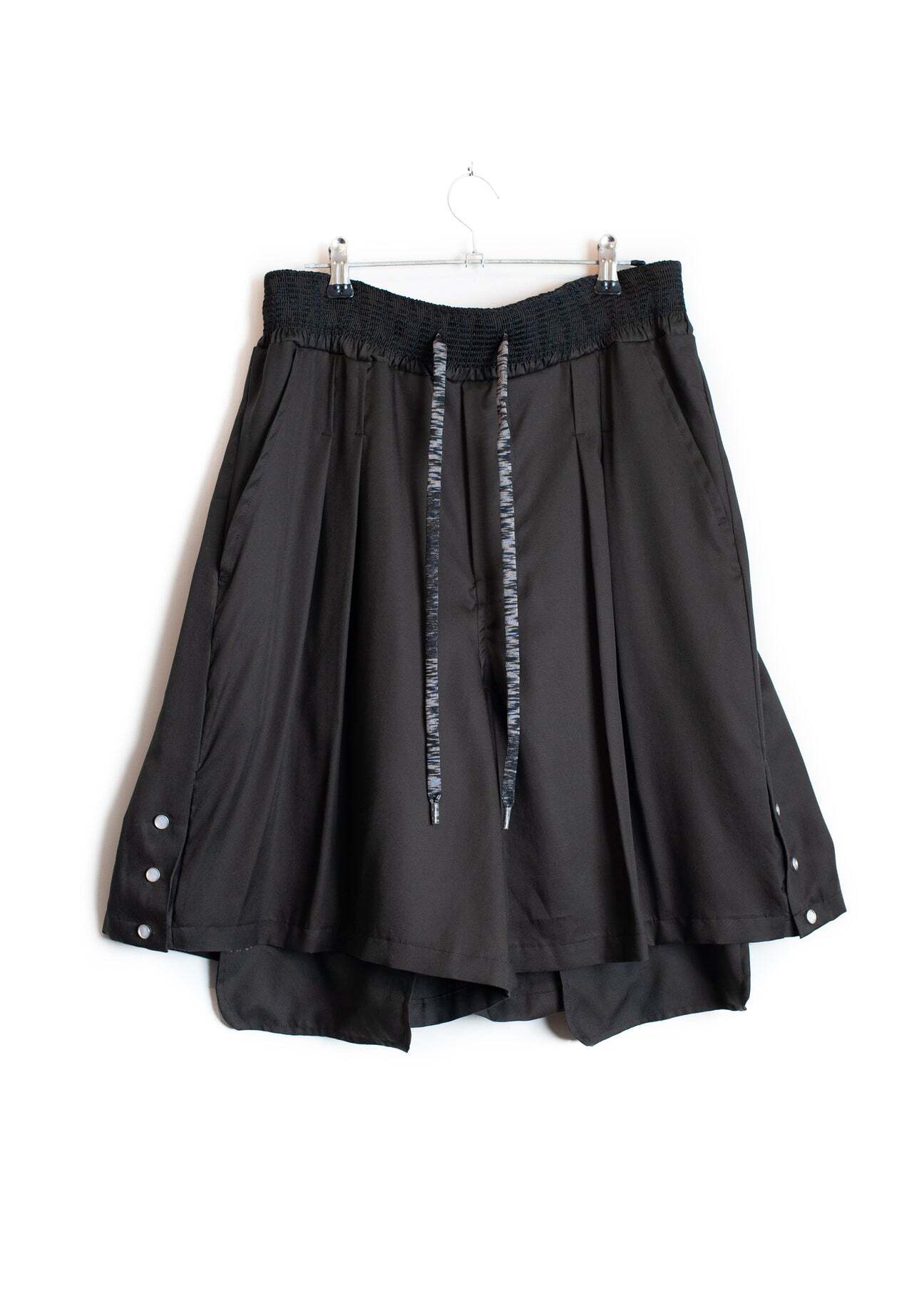 ウエストはシャーリング仕様でリラックス感があり、ドローコード付きで調整も可能。裾のスナップボタンがデザインのアクセントになり、シルエットに変化をつけられるのも魅力です。