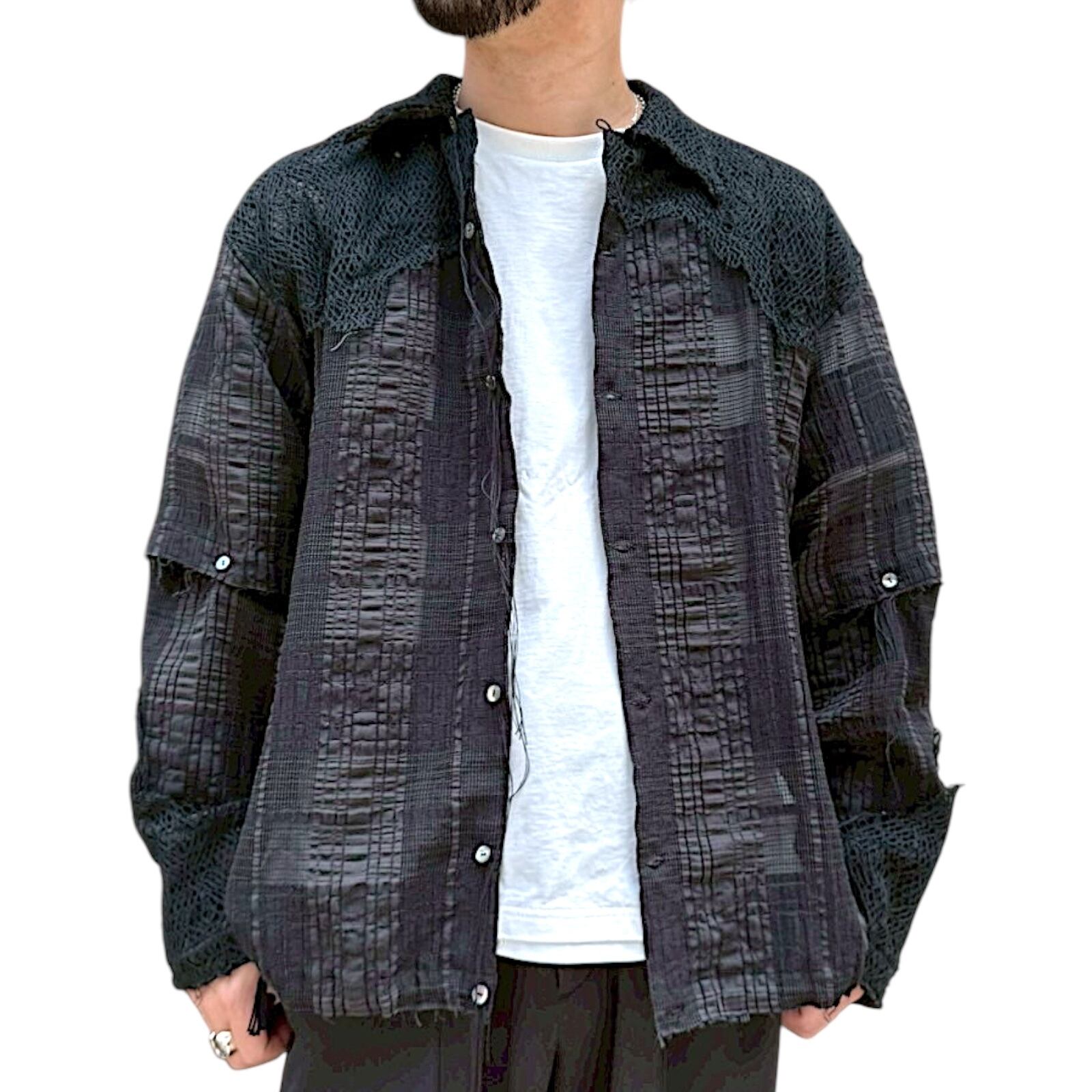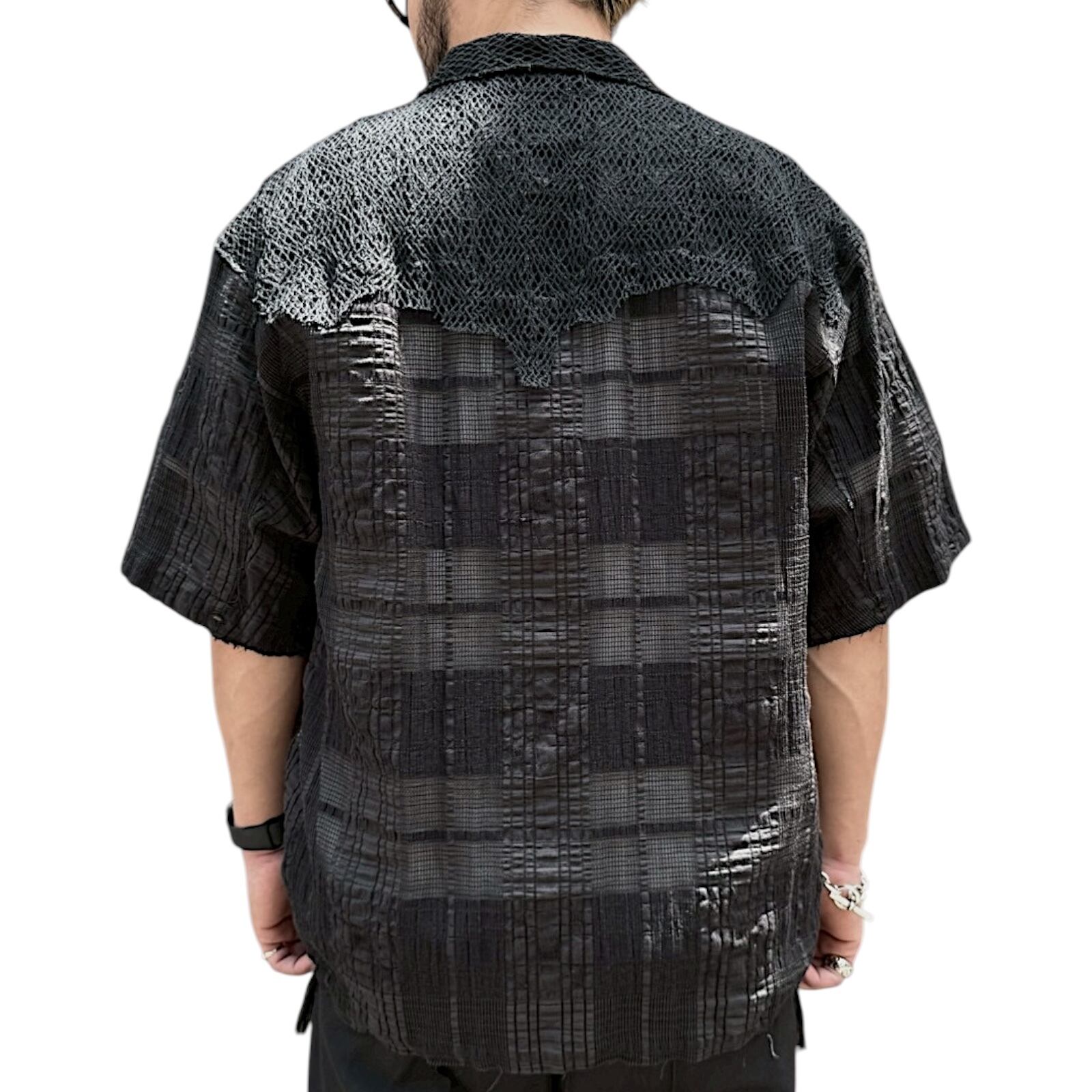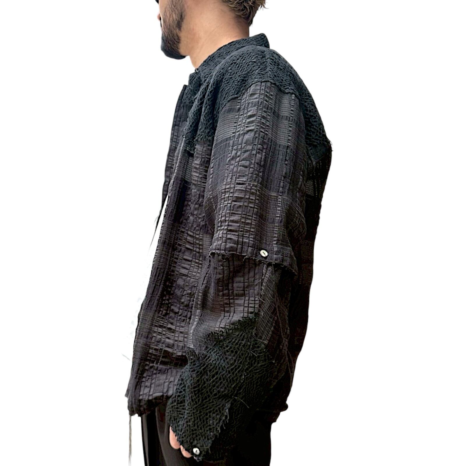 身生地には綿とレーヨンとナイロンをベースに使用したJQ素材を使用。織を変化させところどころメッシュのような透かしがあり真夏でも風通しがよく少し麻を入れることによりハリ感をプラスしています。またアクセントとして別布にクサリ編と呼ばれるメッシュ状の生地をヨークや袖口部分に使用しておりランダムになるよう1点1点職人の手作業により絶妙な断ち切り感を表現。