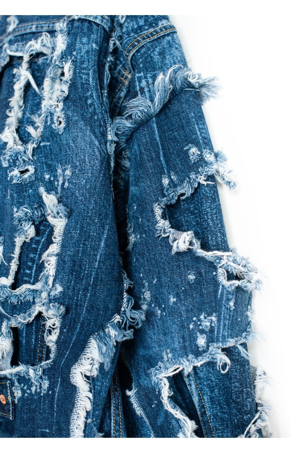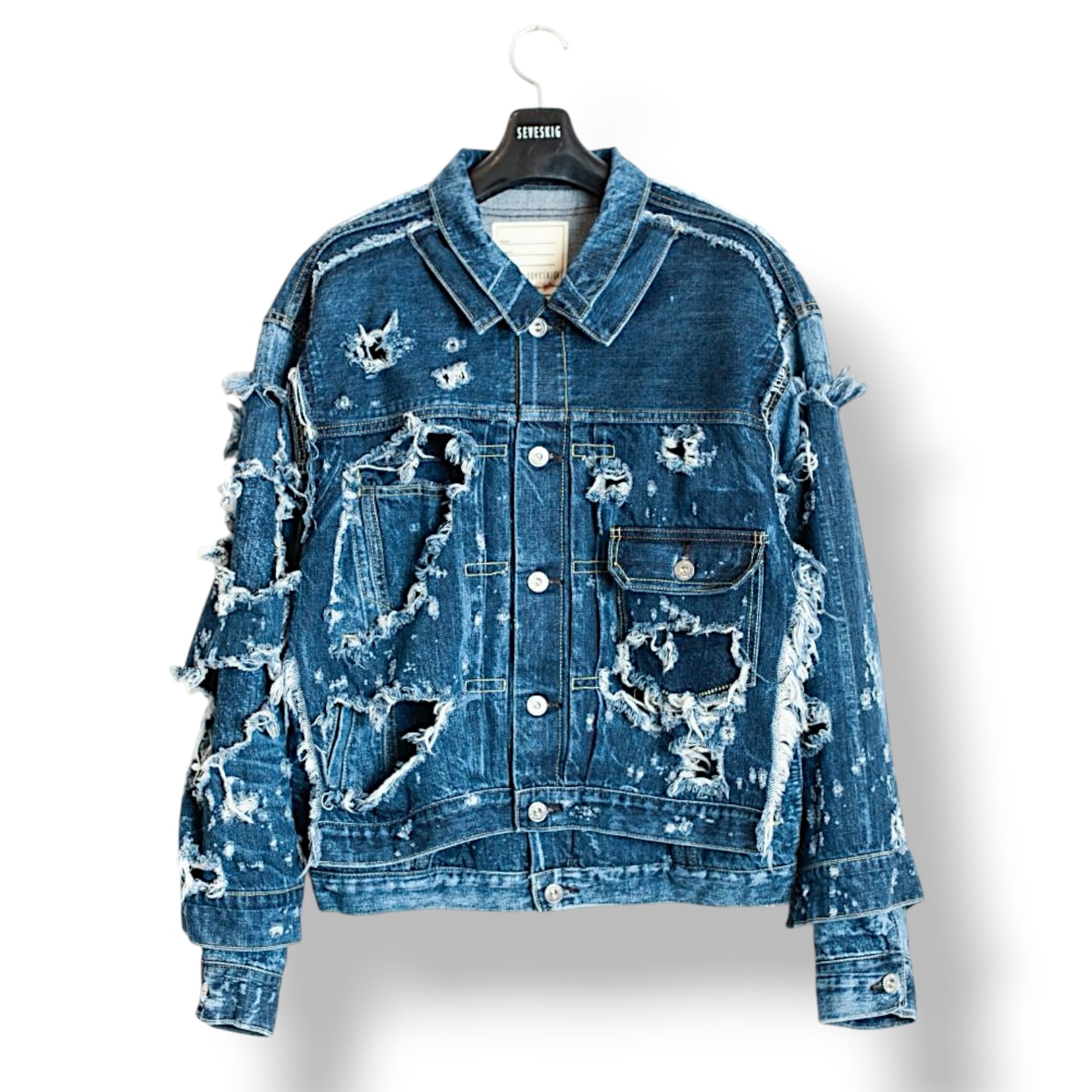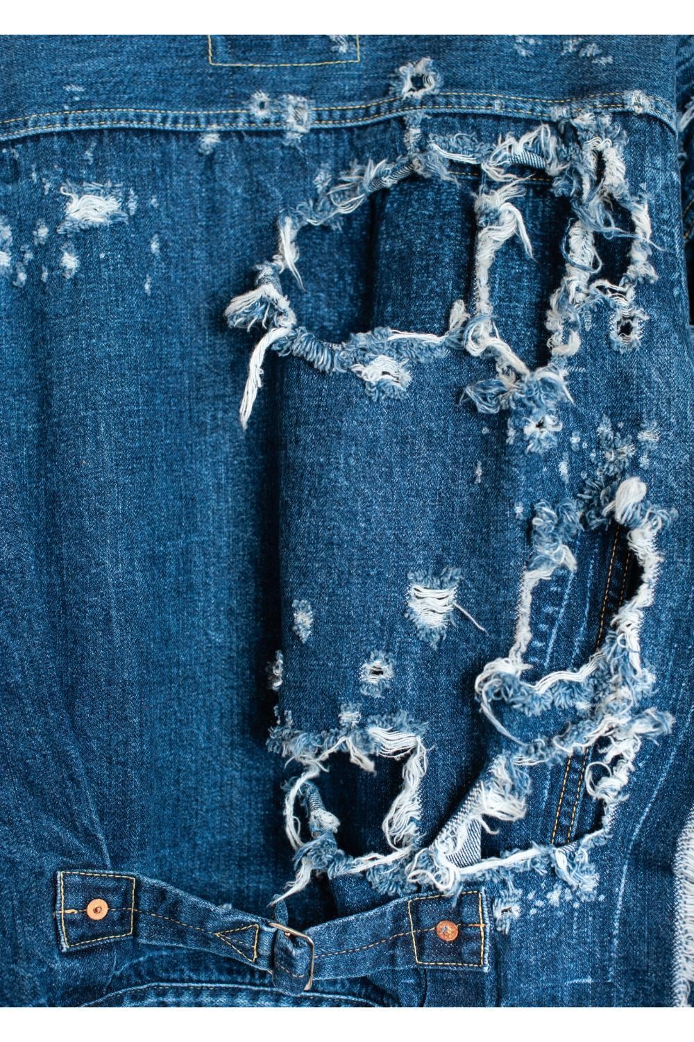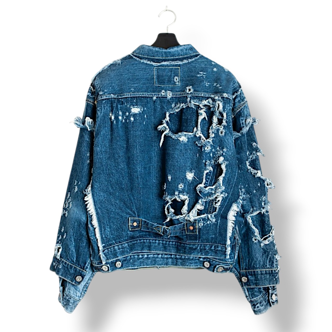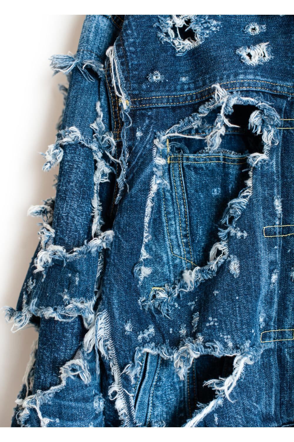 無数のダメージ加工の下に、もう一枚のデニムを再構築的にレイヤードした異素材グランジジャケット。