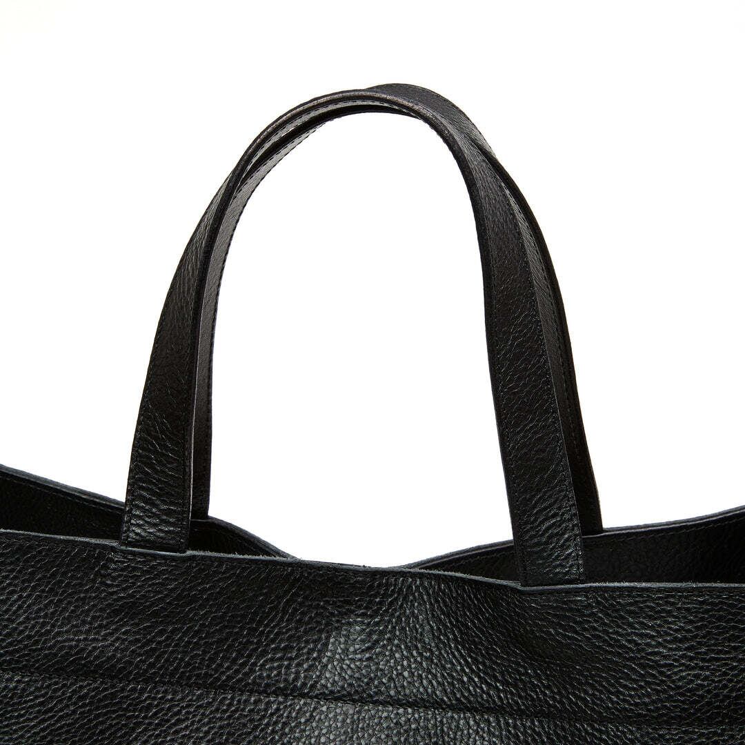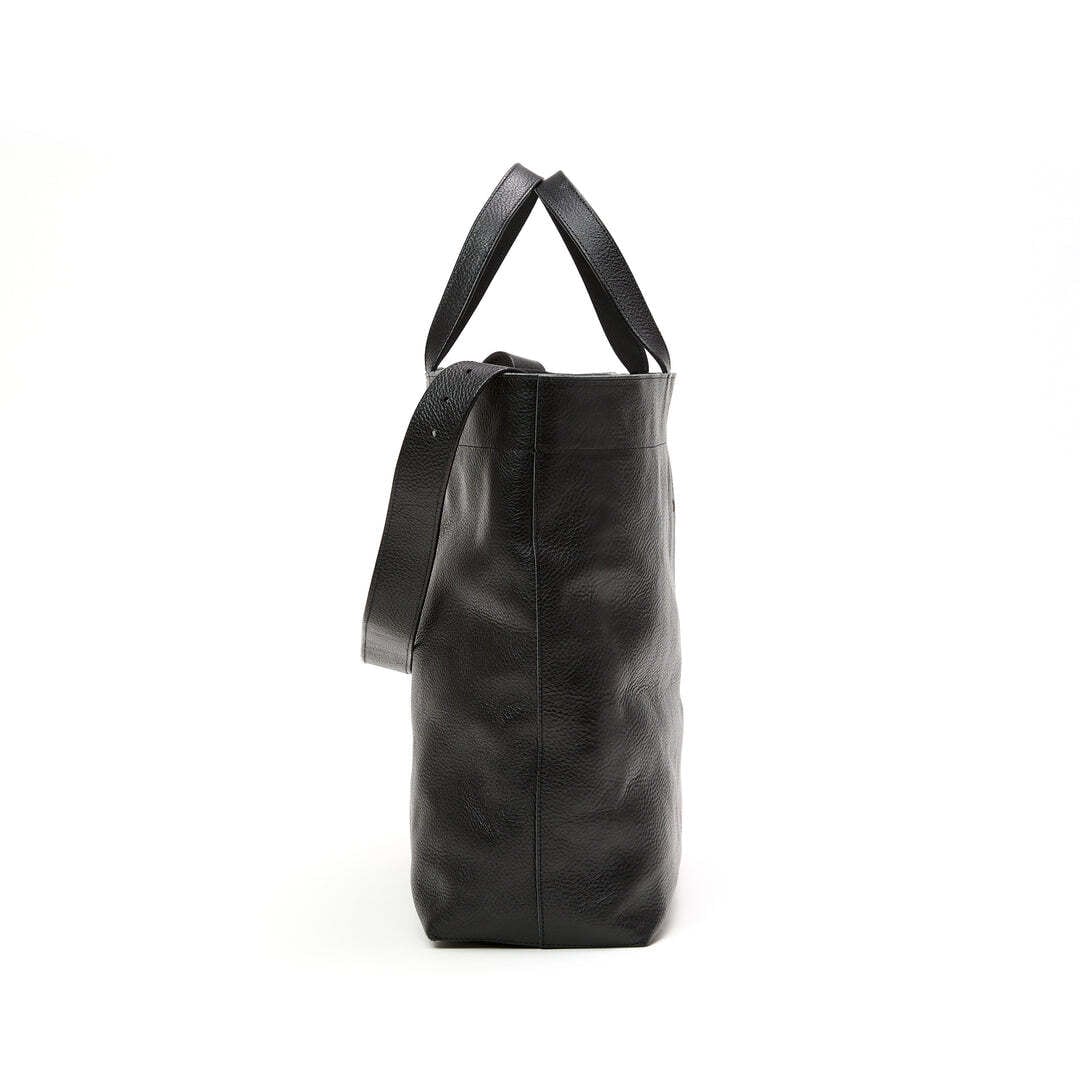 シボ感あるレザーで作製されたトートバッグ。シボが特徴のレザーで使い込む程に、シボ感が消え、光沢感が出てくる経年変化。裏地にはオリジナルペイズリー柄のキュプラ生地を採用。内部の間仕切りポケットはスナップボタン仕様で着脱可能。