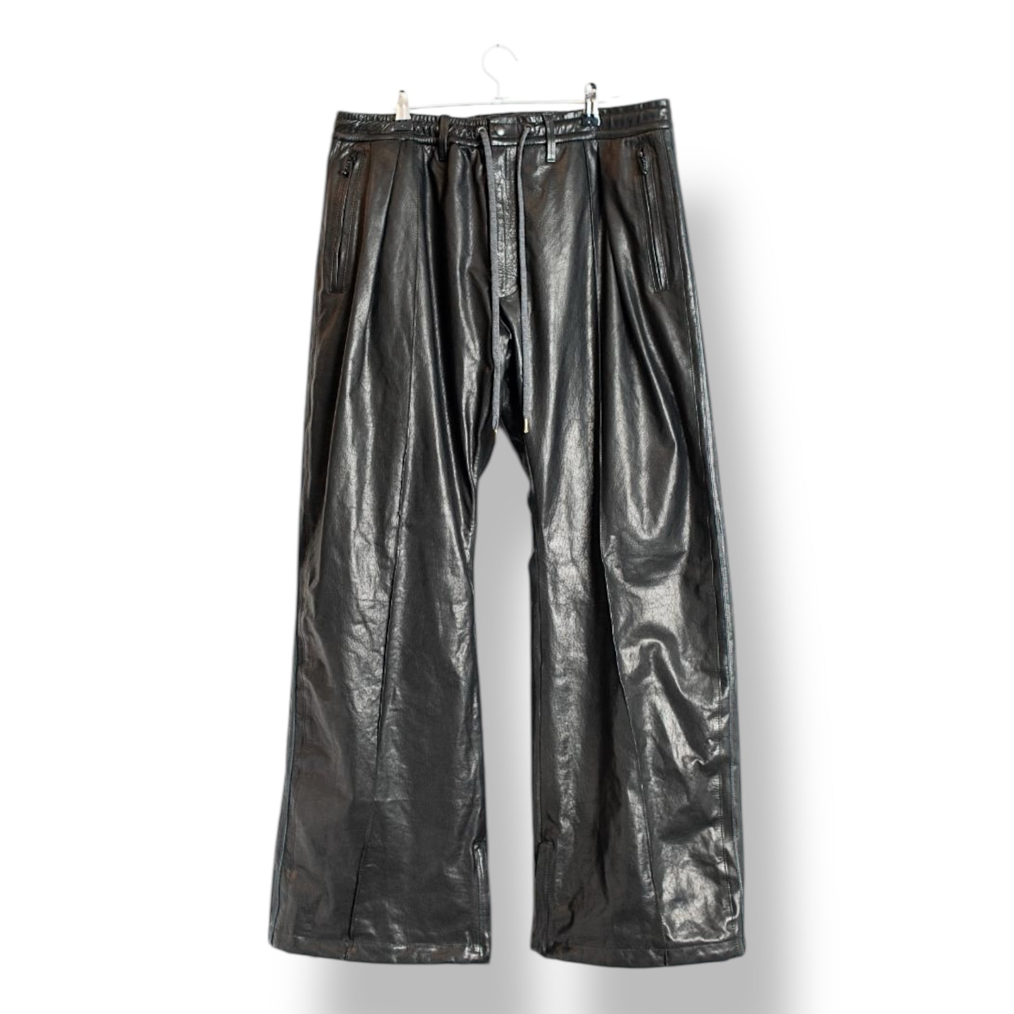 日本産ホルスタイン原皮を、オリジナルの鞣し技法とスムース加工で仕上げた特別仕様のワイドシルエット トラックレザーパンツ。