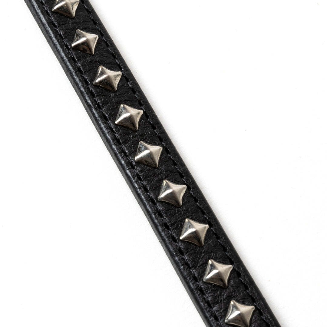 スタッズレザーで作製されたスマートフォンストラップ。チャームレザーにピラミッドスタッズを配した。裏側にもブランドネームの刻印が入る。