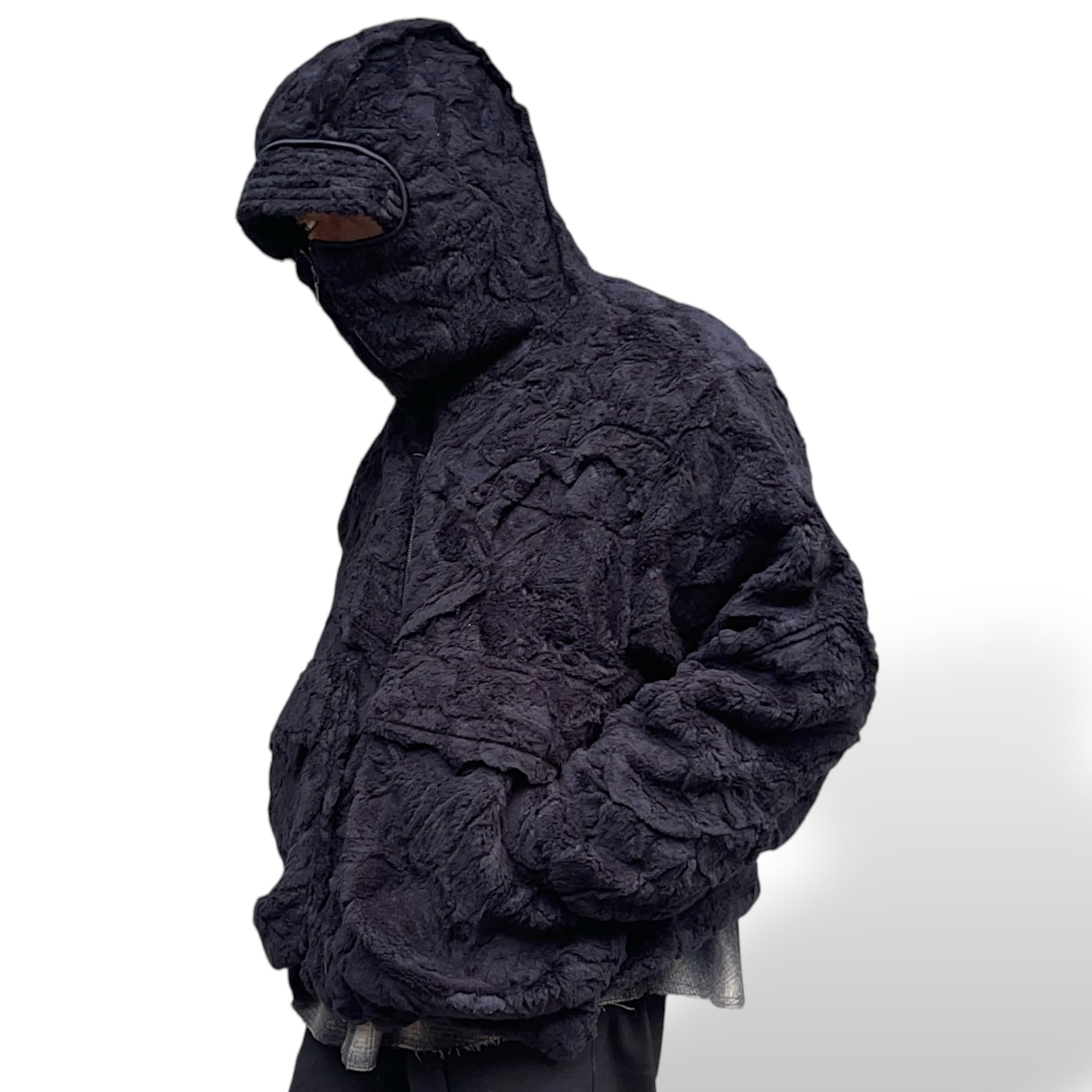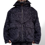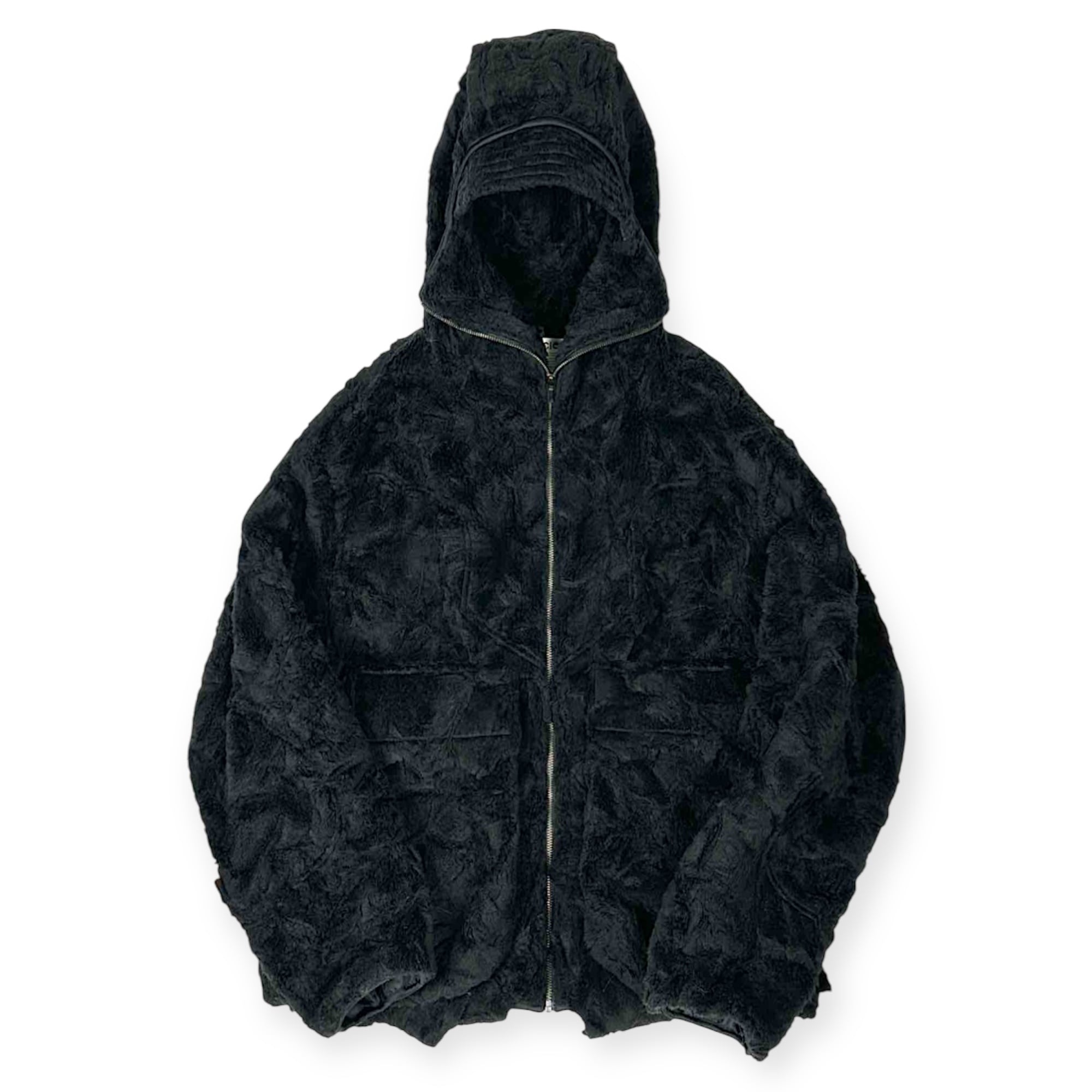 シルエットはフードを被ってファスナーを全て閉めると目だけが覗くバラクラバのような仕様。元々スキーウェアーなどで採用されていたフェイスカバーディティール。フード先にはツバがついており後ろのアジャスターを絞ればよりフィット感が一層出るように設計。ポケットは2層構造で脇から手を入れる部分は深めのマチあり大口ポケット、フラップ部分はめくるとファスナーがついており携帯などを入れる用の少し浅めのポケットとなっております。
