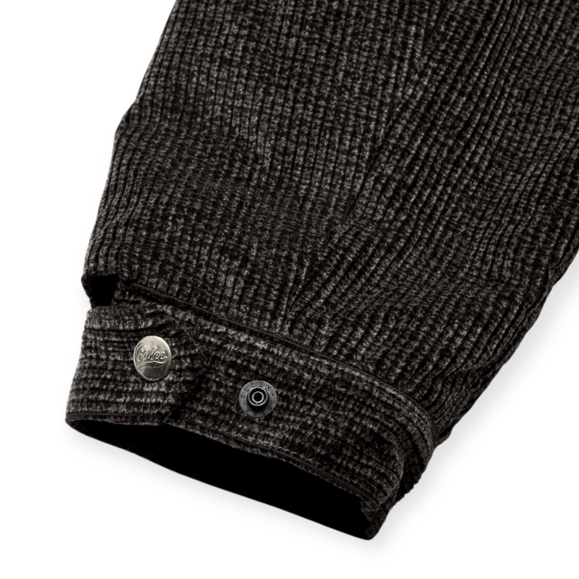 身頃には7.5Wの太畝コーデュロイに、地染めx着抜にて柄を表現した、ヴィンテージリプロダクト生地を採用。ヨーク部分はフェイクスエードで切り替え、オリジナルペイズリー柄の中綿キルト仕様。