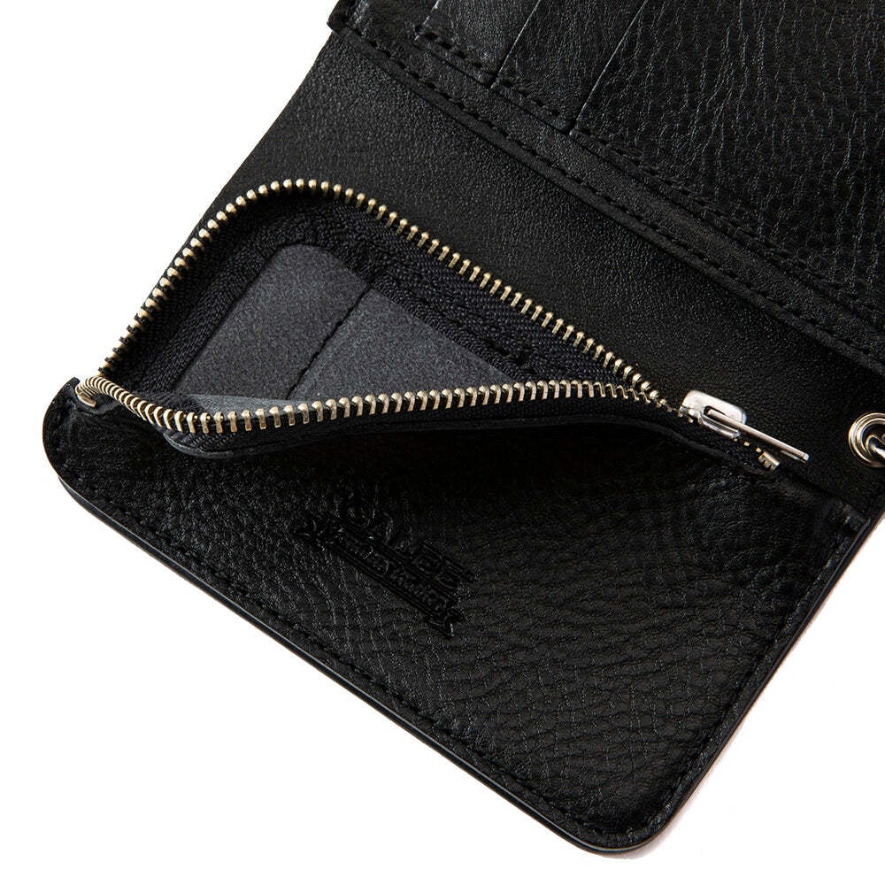 シルバーのスターコンチョボタンを使用し、作製された三つ折りタイプのハーフウォレット。レザーにはシボ感あるレザーを採用。使い込む程にシボが消え、艶感ある経年変化を楽しむ事が出来る。また、収納もしっかりと確保し、使い勝手の良いウォレットに仕上がっている。