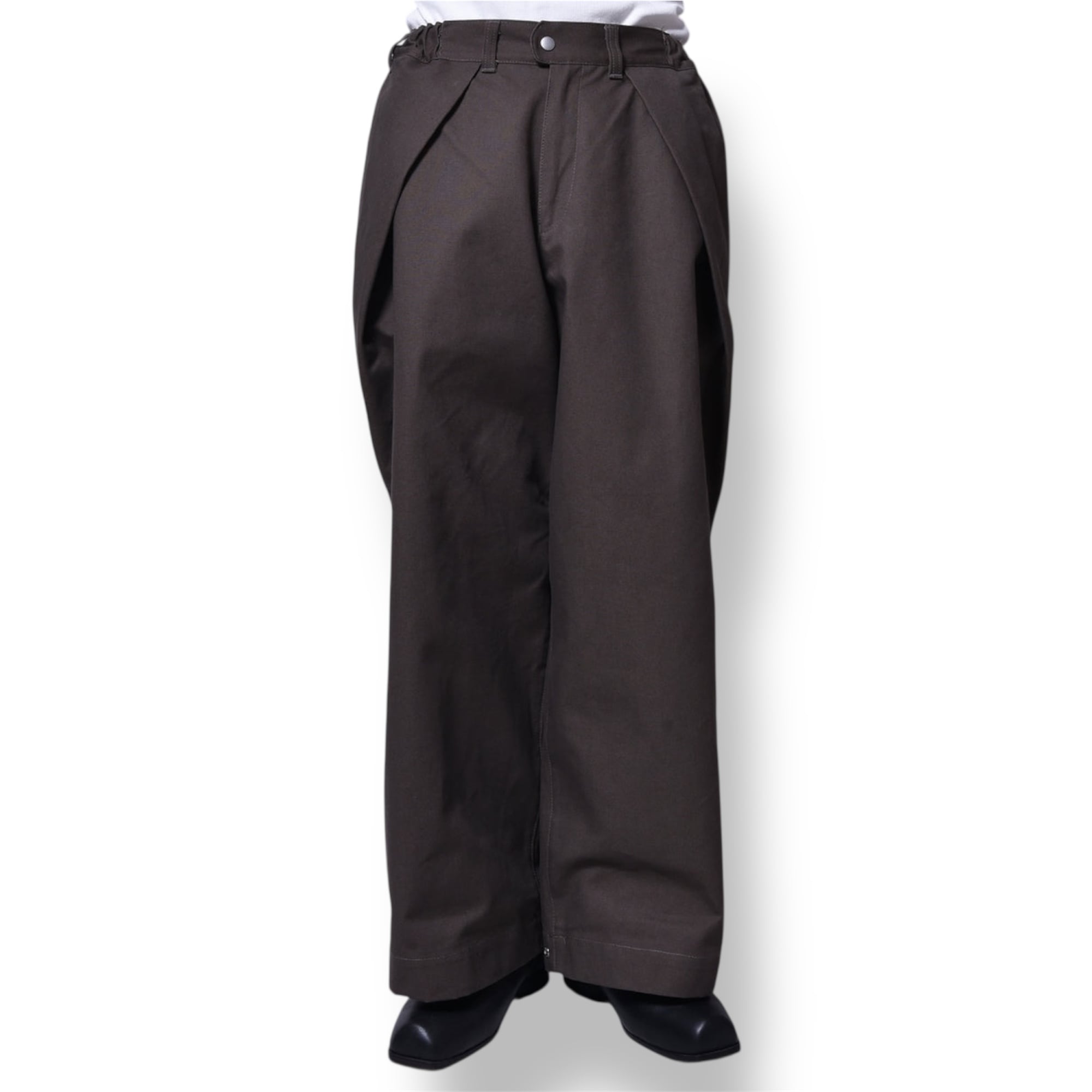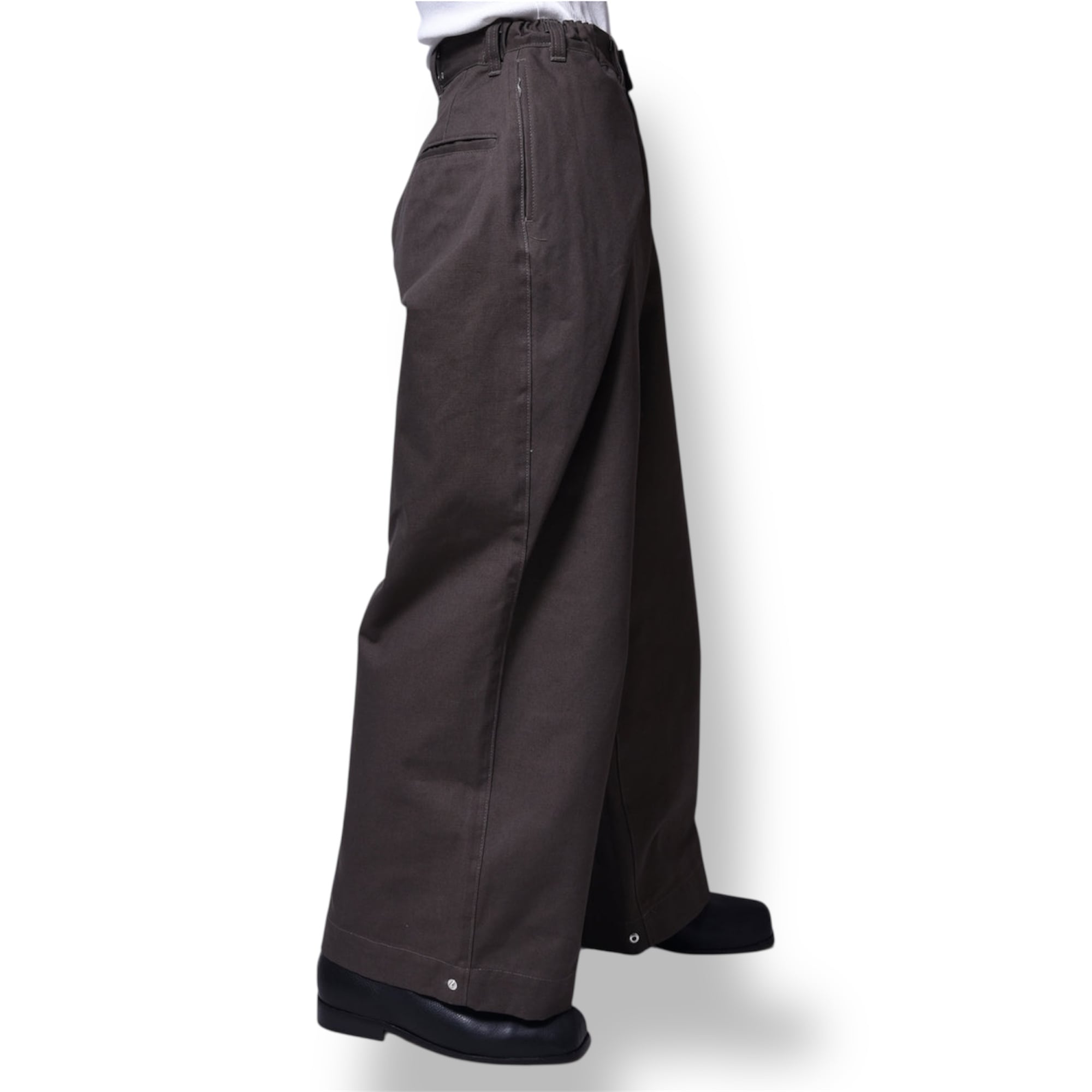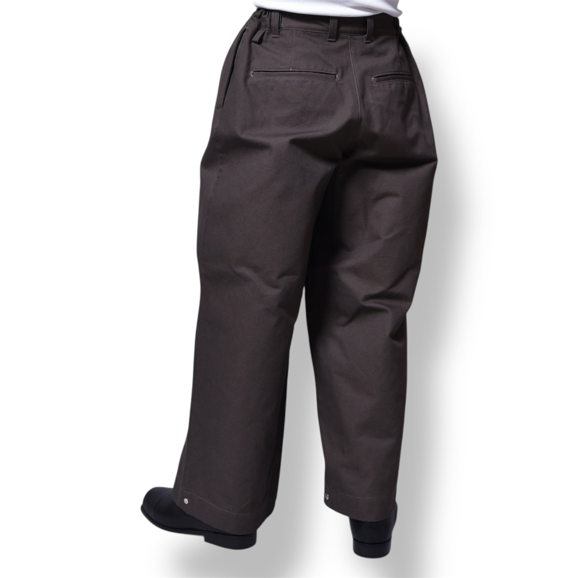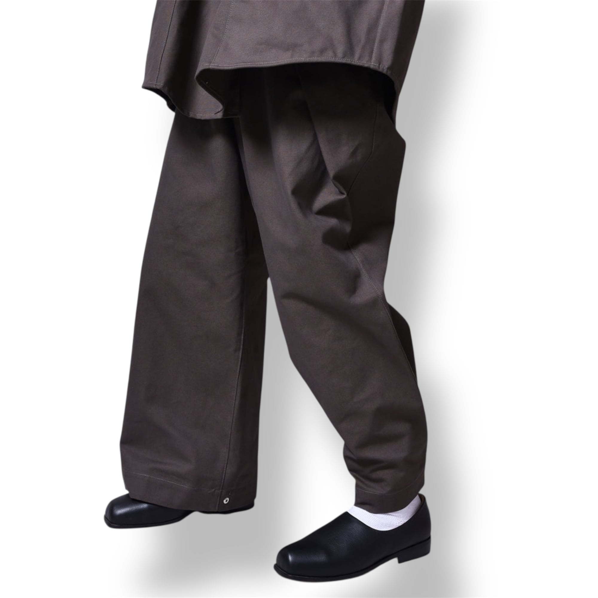 シルエットは程よい長さのオーバーシルエットのワイドパンツ。両サイドに深めのタック、裾にスナップボタンで絞れる調整可能な仕様です。ウエストもサイドゴムシャーなのでストレスなく履けます。履きだすとクセになるタフなパンツです。気分で裾絞っても履けるので幅広いシーンで活躍できるパンツになります。