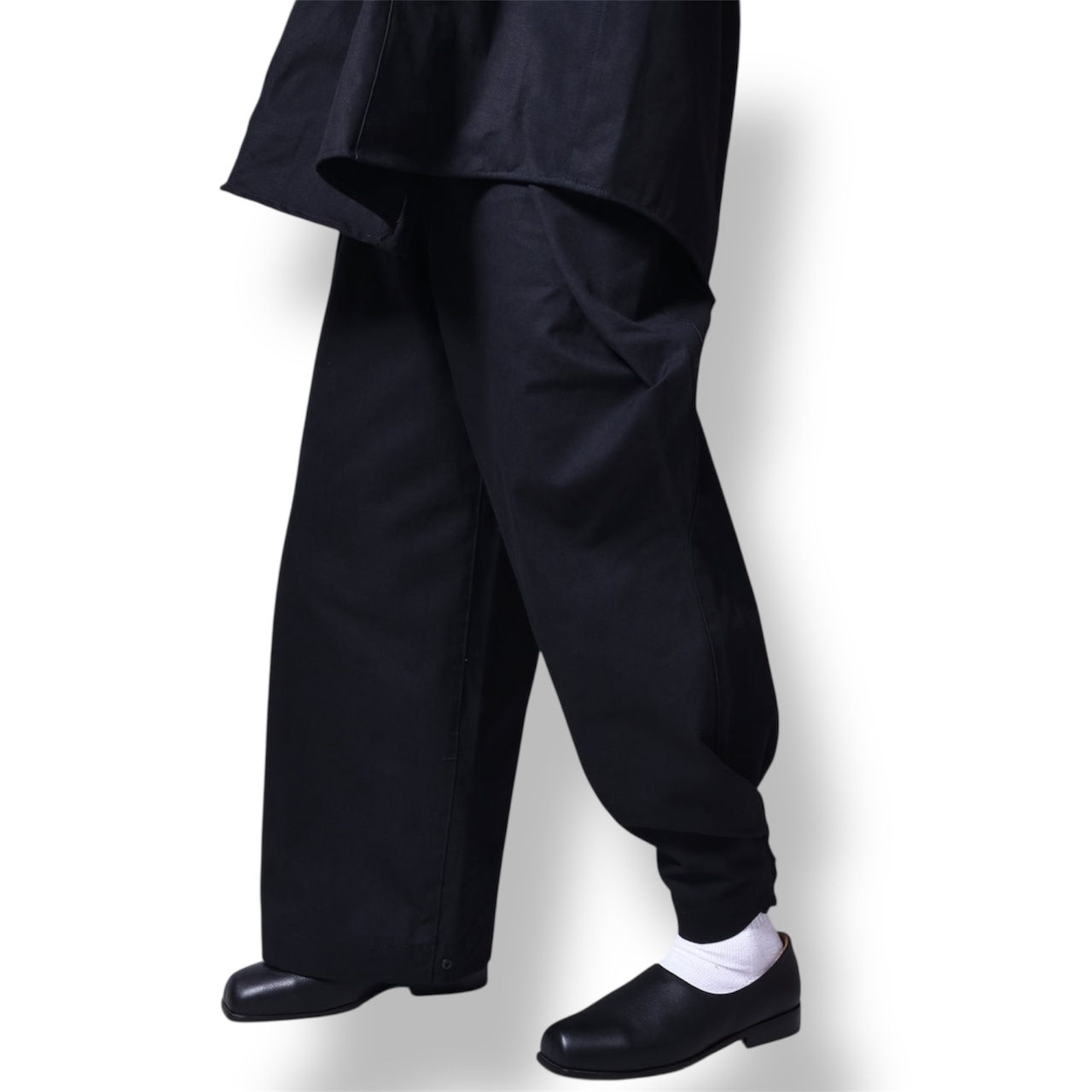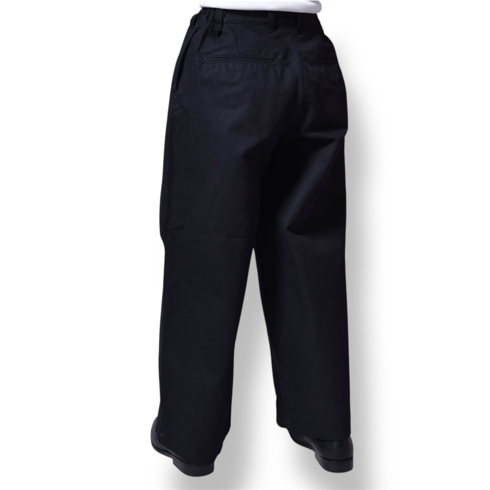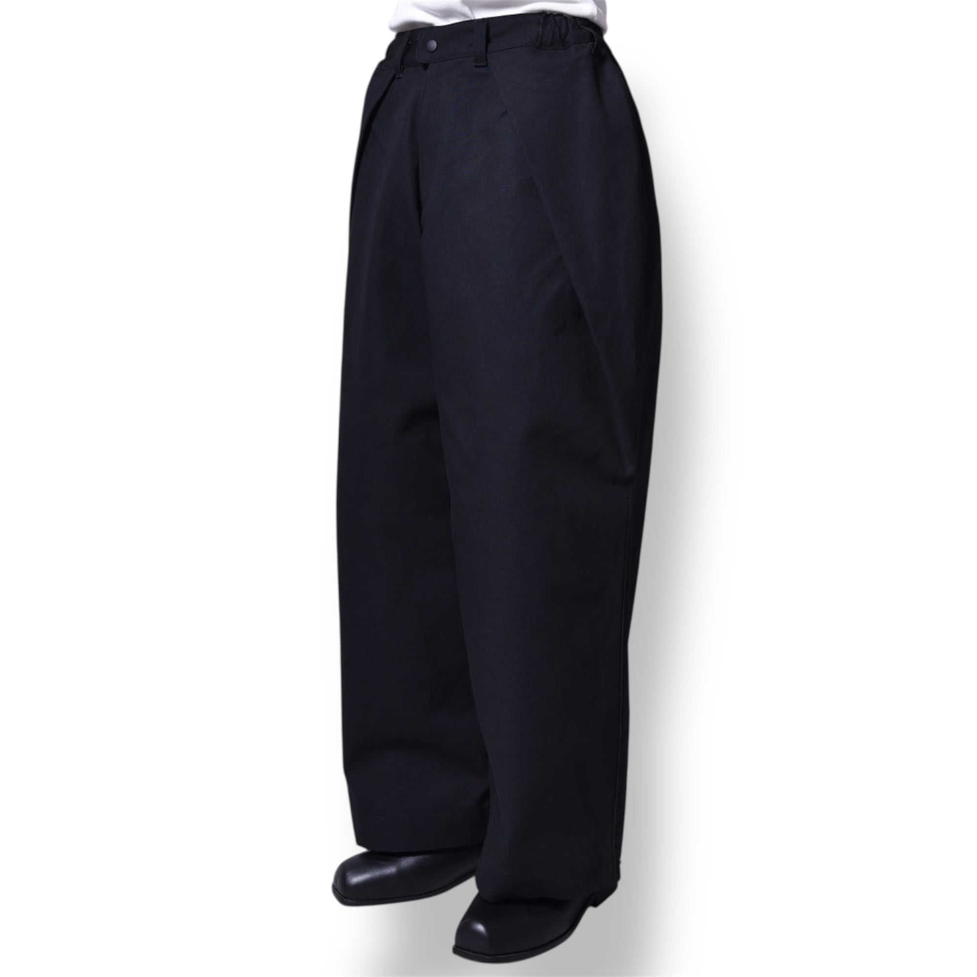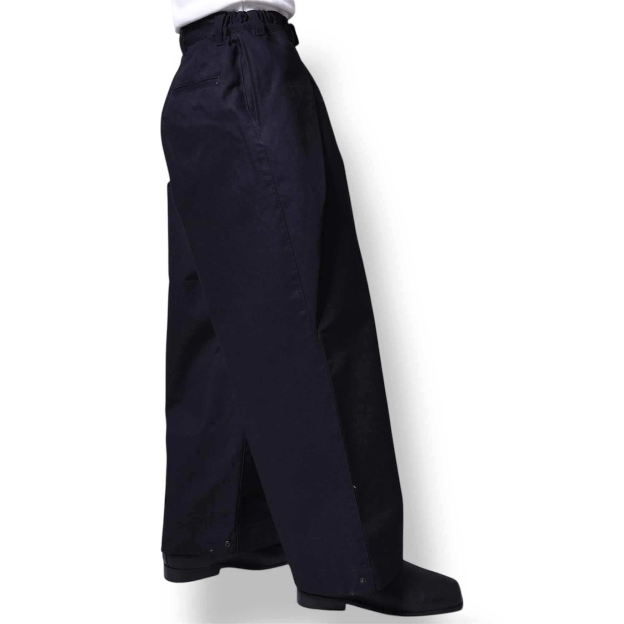シルエットは程よい長さのオーバーシルエットのワイドパンツ。両サイドに深めのタック、裾にスナップボタンで絞れる調整可能な仕様です。ウエストもサイドゴムシャーなのでストレスなく履けます。履きだすとクセになるタフなパンツです。気分で裾絞っても履けるので幅広いシーンで活躍できるパンツになります。