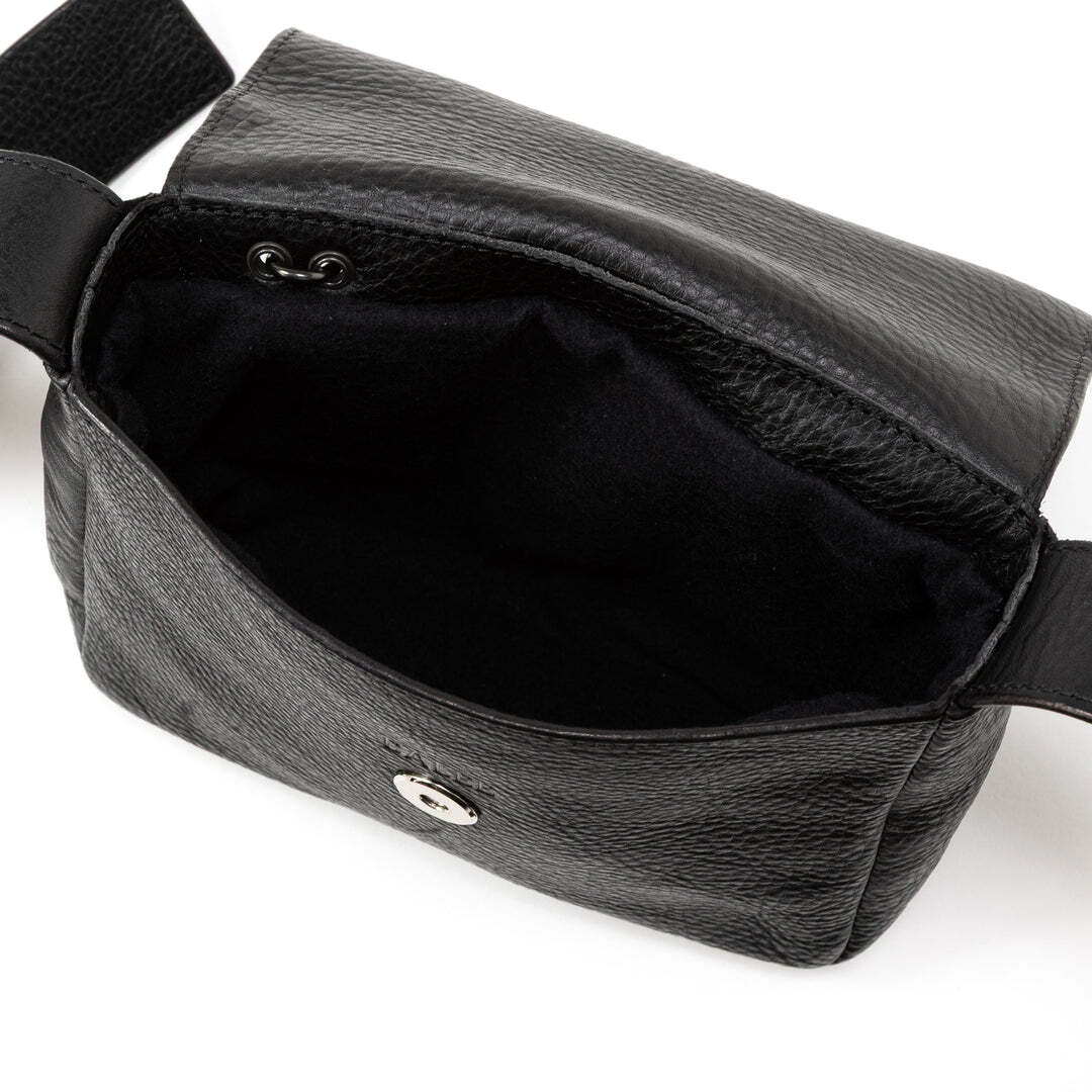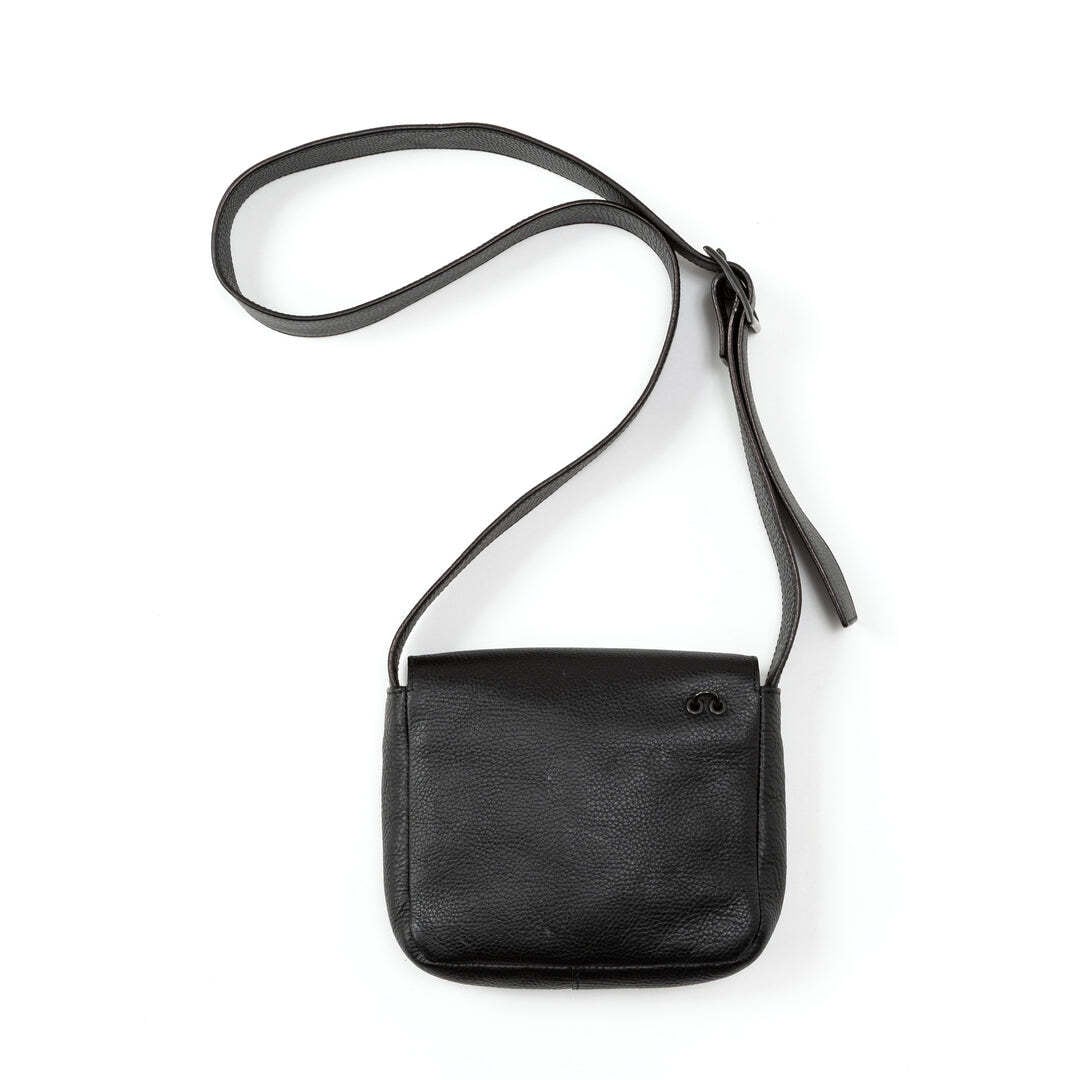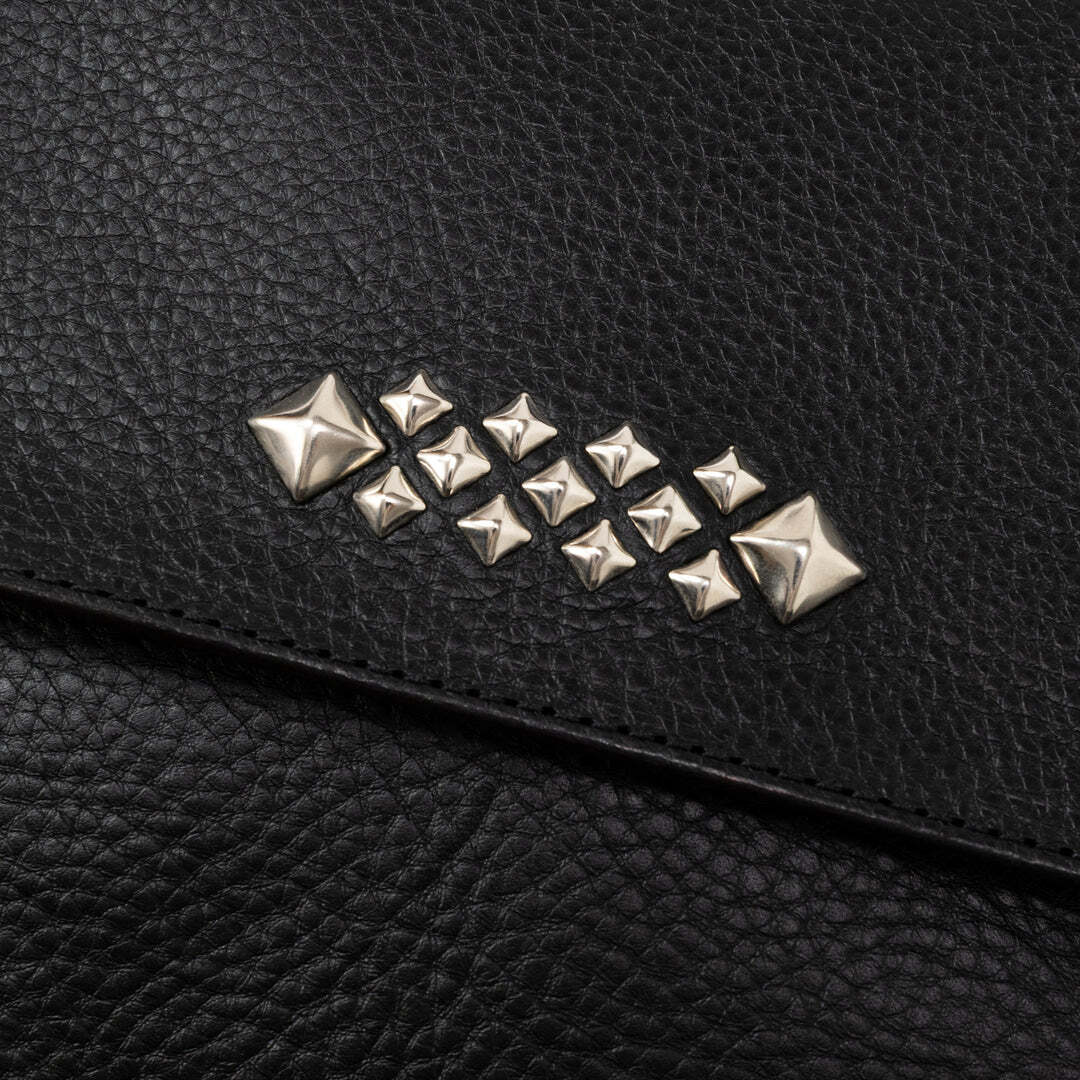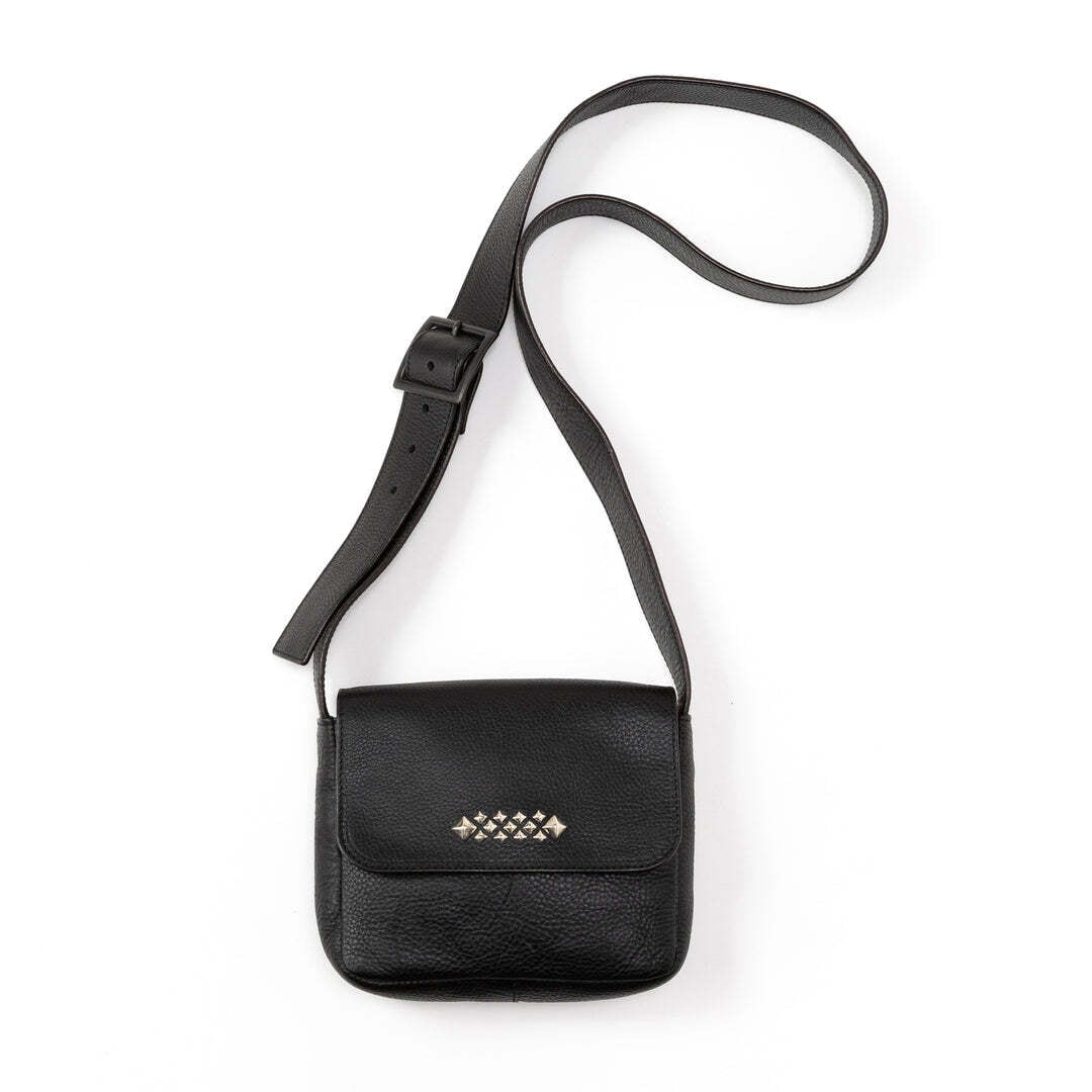 レザーショルダーポーチバッグ。イタリア、トスカーナ地方にて、 職人の手により1枚1枚丁寧に手鞣し、手染めされたイタリアを代表する最高級ハンドメイドレザー、アリゾナレザーを採用。革本来のナチュラルな風合いとシボが特徴。フラップ部分にピラミッド型スタッズ、ショルダーベルトにダール加工したバックルを使用。