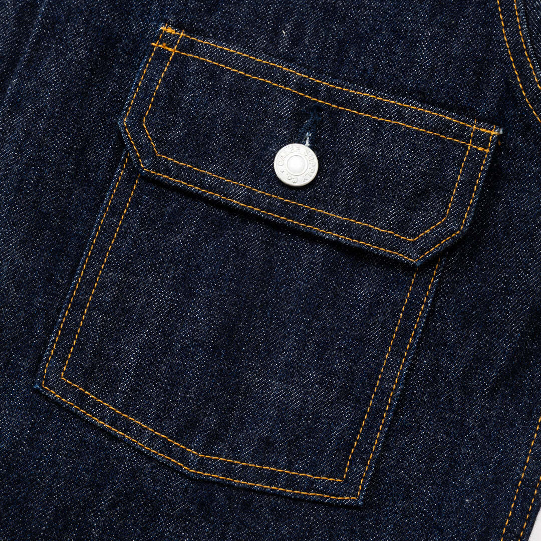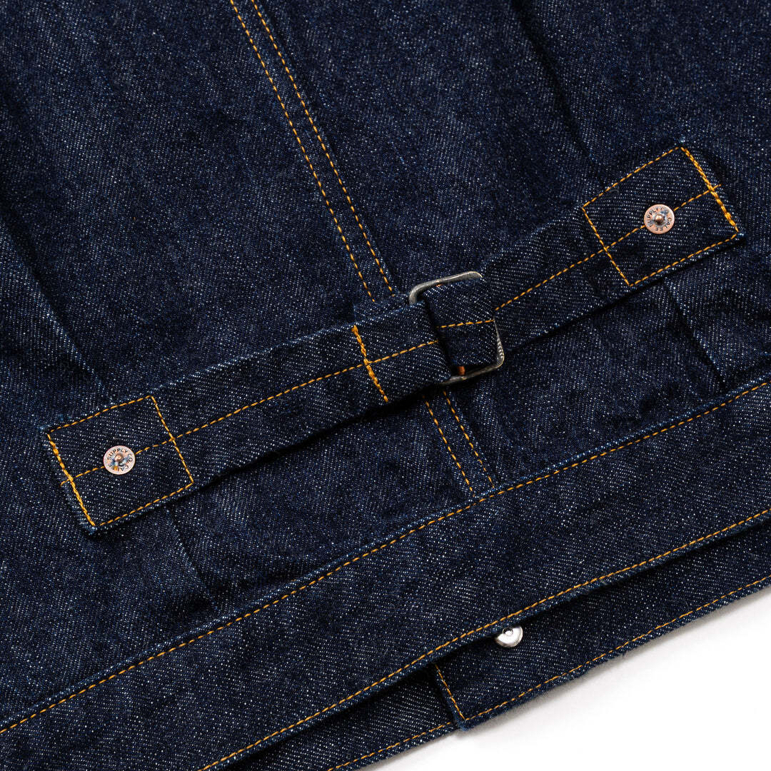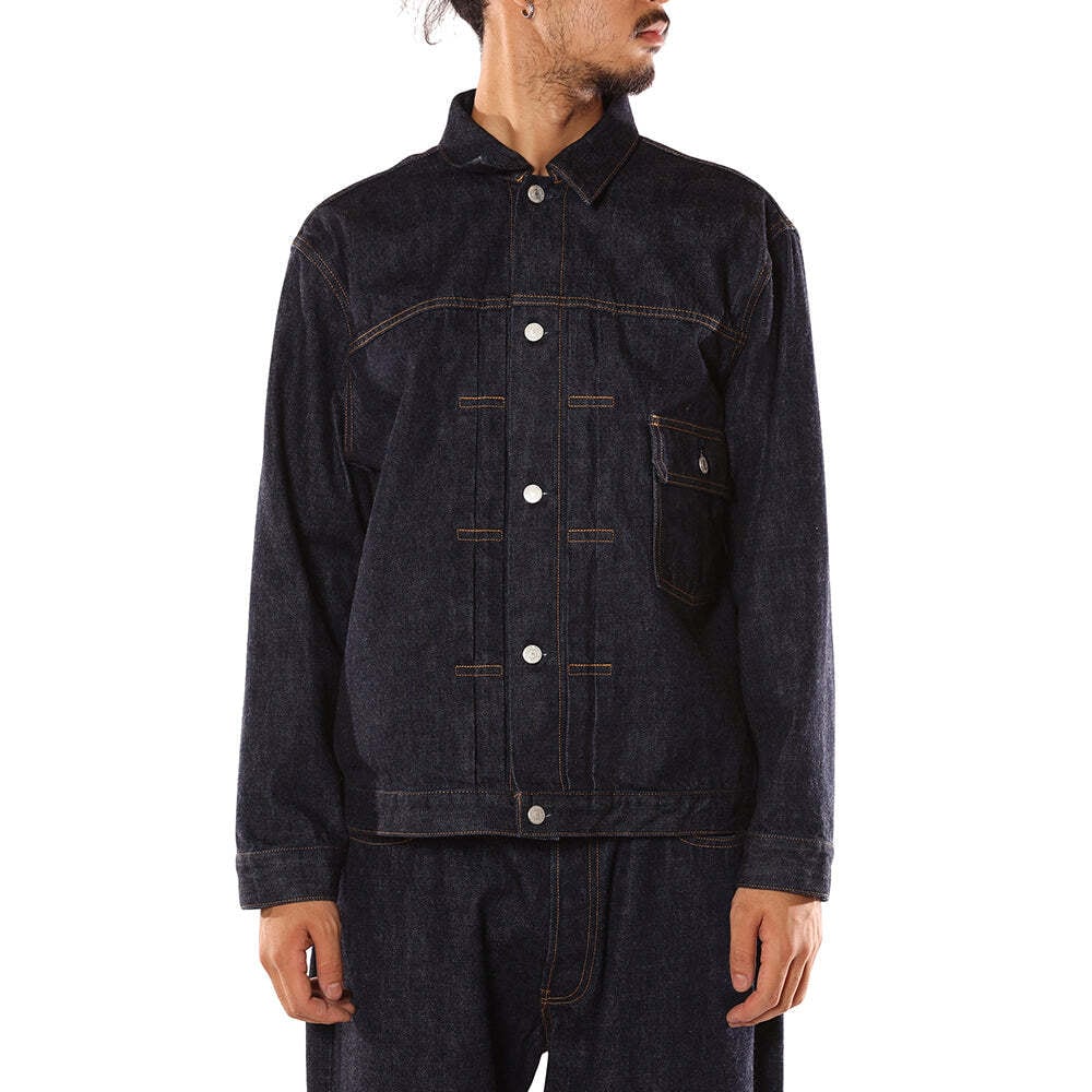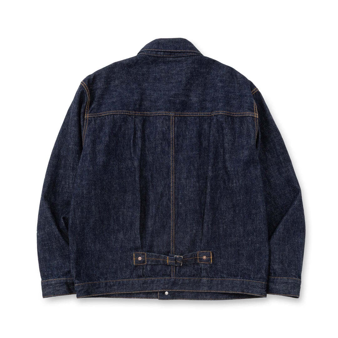 1stタイプデニムジャケット。単一米綿を使用した、ピュアインディゴの14ozヴィンテージリプロデニム生地を採用。毛焼きなしのサンフォライズ加工仕上げで、表面に生機の様な毛羽感があるのが特徴で、米綿特有のムラ感と、ドライタッチでガサついた粗野な風合い。Tバックディテール。ワンウォッシュ仕上げ。
