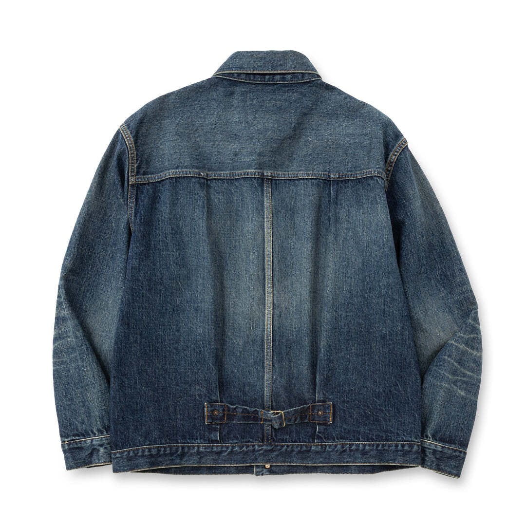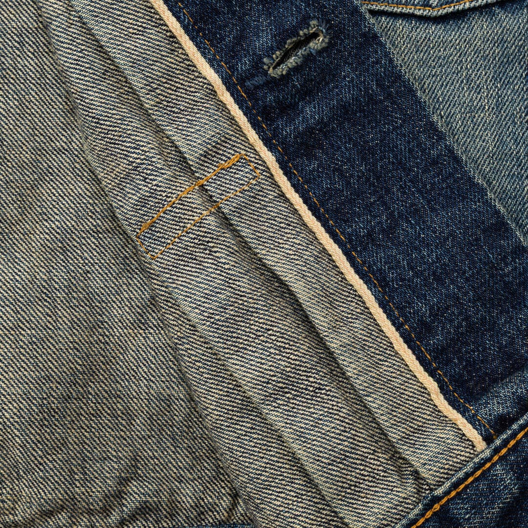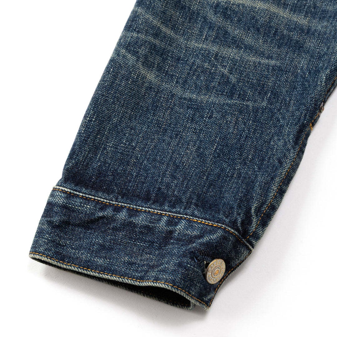 1stタイプUSEDデニムジャケット。単一米綿を使用した、ピュアインディゴの14ozヴィンテージリプロデニム生地を採用。毛焼きなしのサンフォライズ加工仕上げで、表面に生機の様な毛羽感があるのが特徴で、米綿特有のムラ感と、ドライタッチでガサついた粗野な風合い。Tバック仕様。職人により一点一点手作業にてUSED加工を行っている。