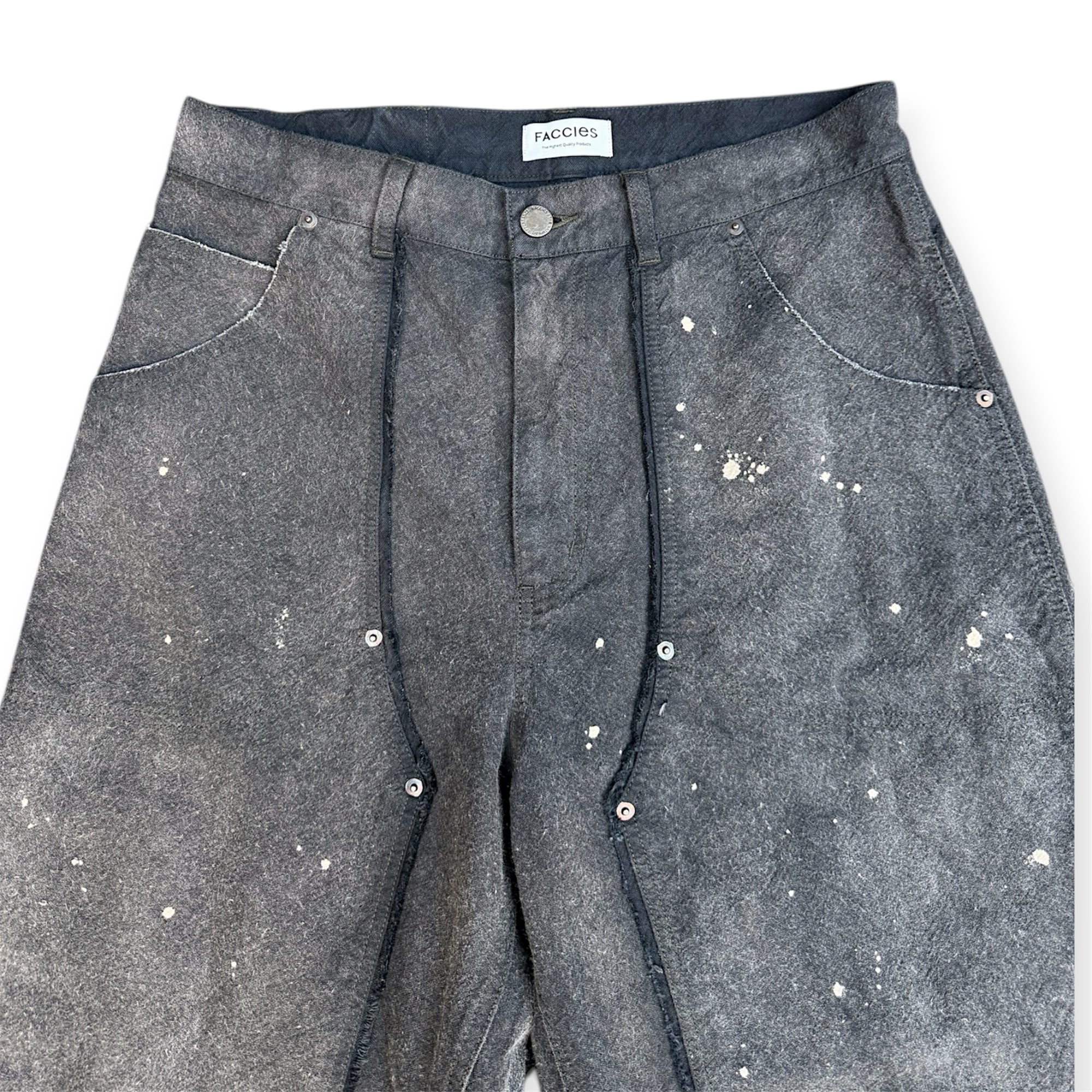 シルエットはワイドストレートのダブルニーペインターパンツ。ダブルニー部分には間に断ち切りの生地を挟み込み洗いをかける事によりフリンジ感(ほつれ感)を表現。程よいダメージャシェービング、オイルペンティングなどリアルに経年された雰囲気を再現。
