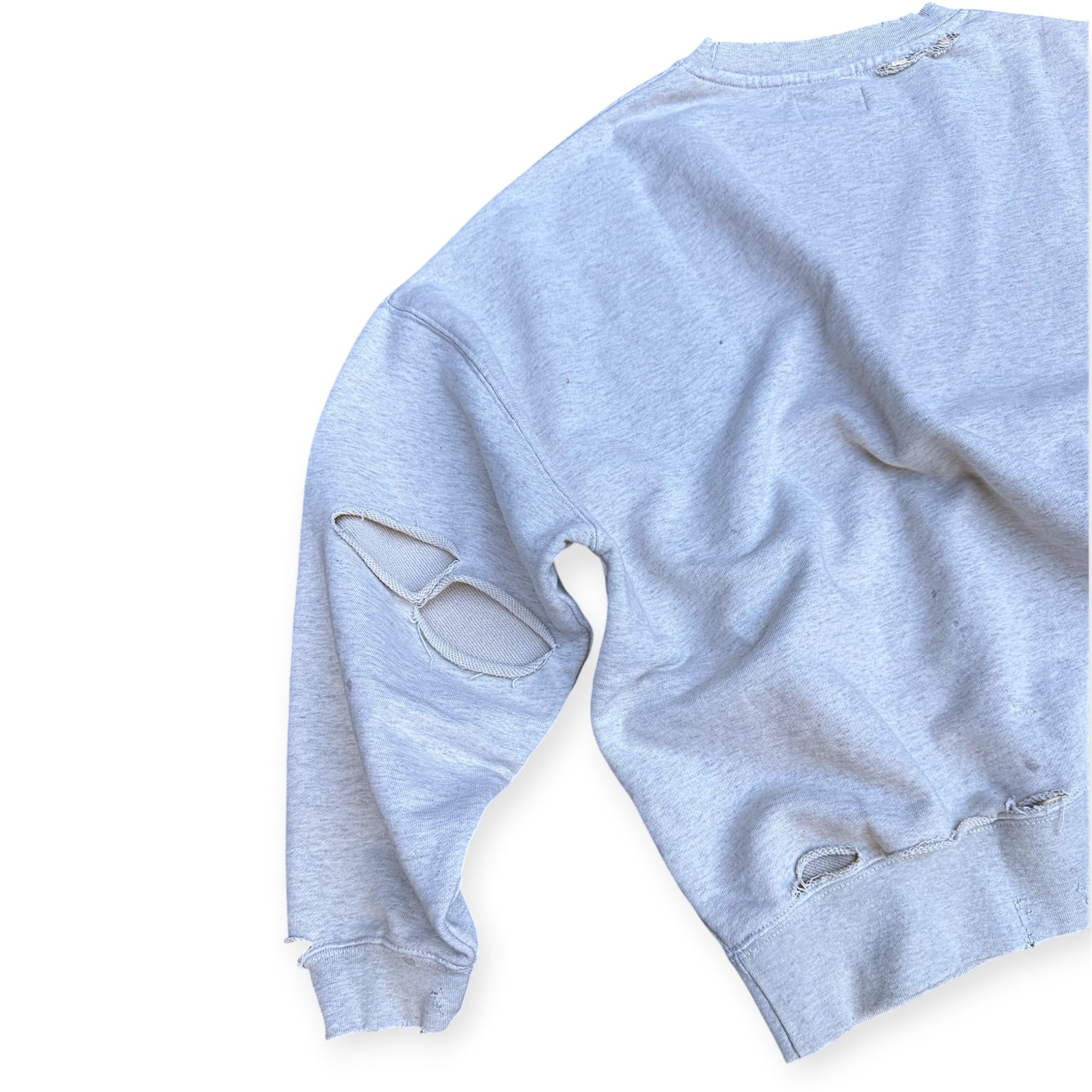 表材には定番の厚過ぎない裏毛生地を使用し加工を入れたプリントスウェットになります。それぞれのカラーで加工の段階で独自のレシビで染め、プリーチ、ダメージ、汚し、焼きと1点1点職人さんの手作業により絶妙な塩梅で仕上げ着古したスウェットを作成。リアルに経年された雰囲気を手作業で1点1点こだわり抜いた1枚に仕上げている。