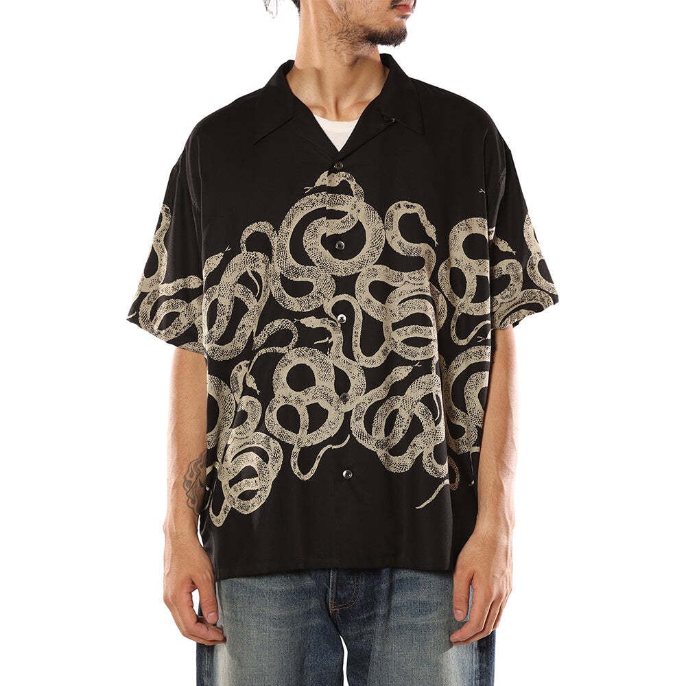 スネークパターンオープンカラーS/Sシャツ。ポリエステルの芯にレーヨンを巻き付けたコアヤーン糸を作り、アムンゼン組織にて製織した生地を採用。表面はレーヨンでもポリ芯に撚ることでシワになりにくいのが特徴。身頃、背面、袖それぞれのパーツにスネークパターンプリントを配置。生地にオリジナルスネークパターンを余白が残る様にプリントし、裁断、縫製を行っている。