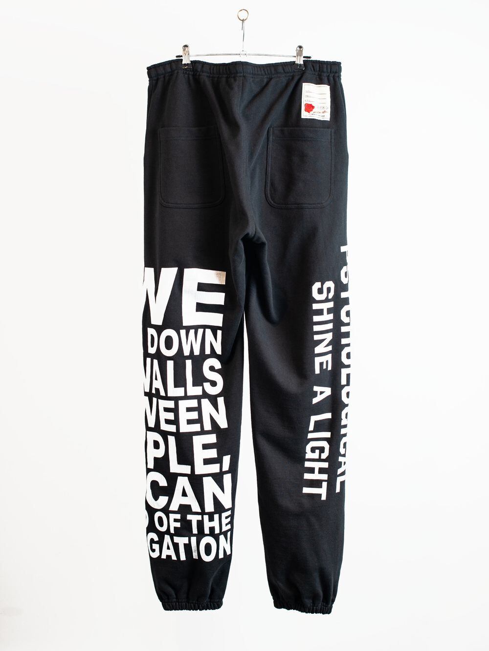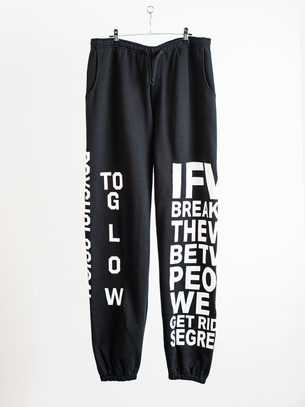 全面に今期のメインワード『If we break down the walls between people, we can get rid of segregation.』をクラックプリントしたスウェットトラウザース。