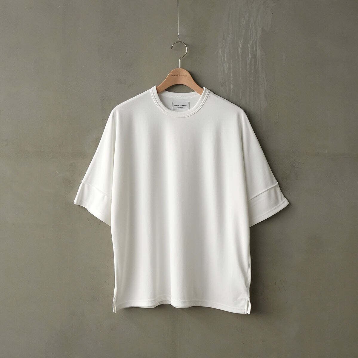 生地の落ち感を活かしたドルマンスリーブと縫いによって重ね着風にした袖が特徴的なデザインTEEです。