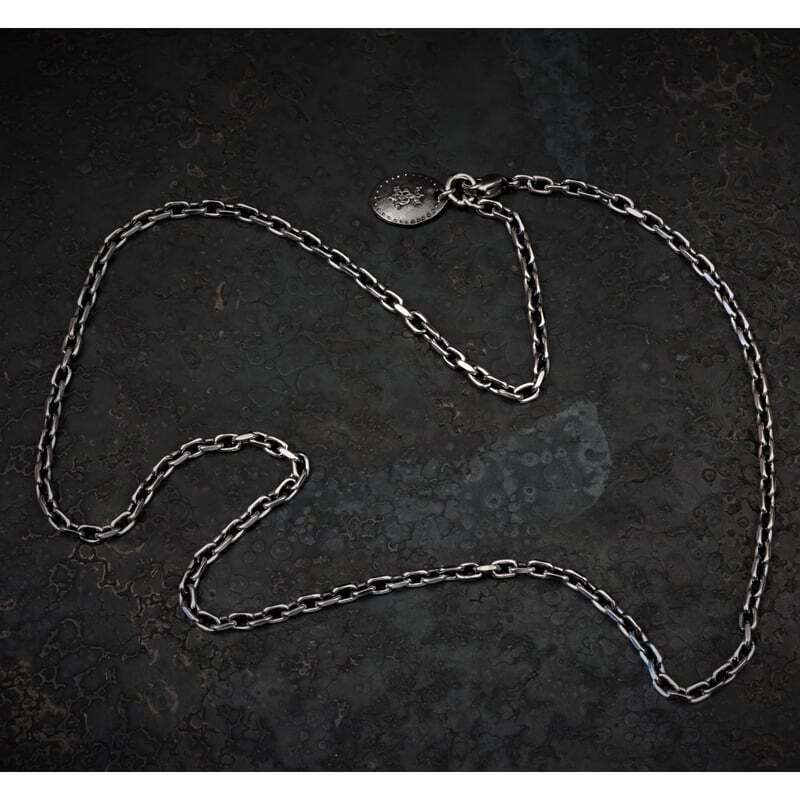 銀の質量を感じる重厚で力強いデザインで、オーバル型に成型したコマを繋ぎ合わせたうえで4面にカッティング加工を施しています。